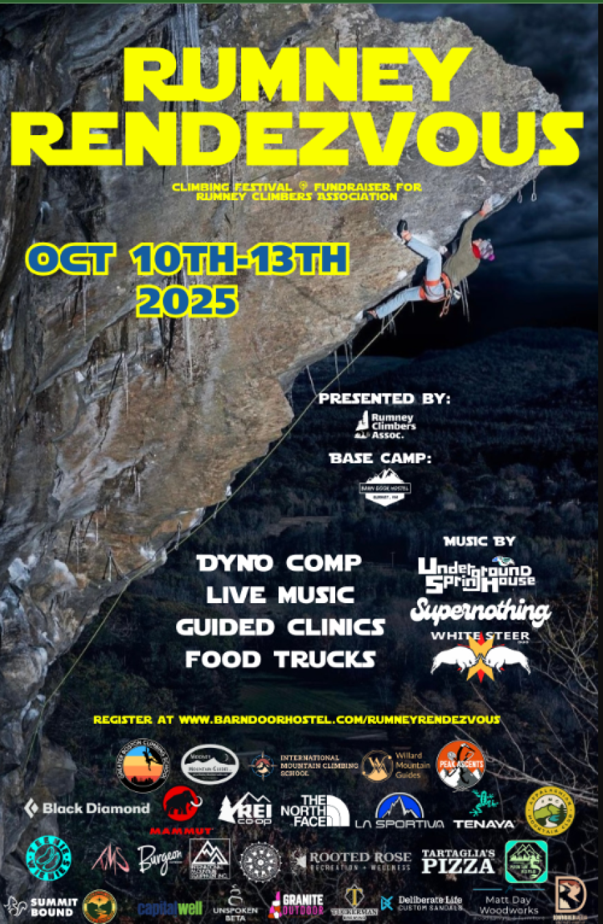 - Rumney Rendezvous Climbing Festival runs from Friday, Oct. 10, through Sunday, Oct. 12, at the Barn Door Hostel. This festival includes full day clinics, workshops, and opportunities to meet other climbers. More details. (Weekend passes start at $85)