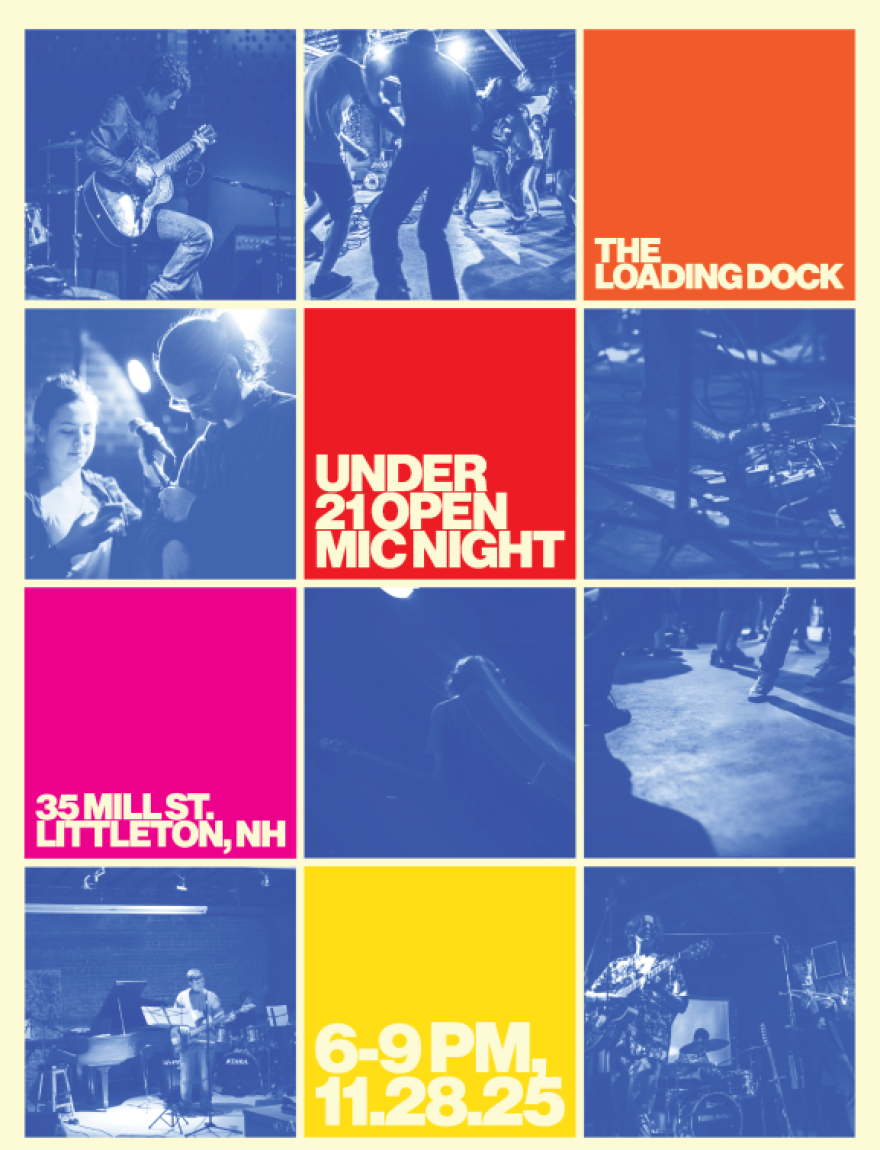 Poster by Atticus Hammill- Under 21 Open Mic from 6 to 9 p.m. on Friday, Nov. 28, at The Loading Dock in Littleton. If you want to participate, you can sign up at the door or email info@theloadingdocknh.com ahead of time. More details. ( Free)