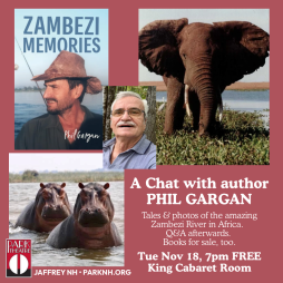 Phil Gargan from Harrisville will regale us with his recollections brought to life as he canoed the mighty Zambezi. Over almost 20 years, he guided many adventurers through the wild, majestic waters of the Zambezi. Each trip became a unique experience of connection with nature, and unforgettable memories.