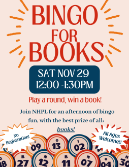 Join NHPL for an afternoon of bingo fun, with the best prize of all: BOOKS! This event requires no registration, is open to the public, and available for all ages.