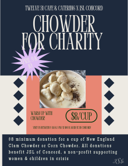 On Thursday, April 9 and Friday, April 10, all proceeds from Twelve 31’s clam and corn chowder will be donated to JSL, a nonprofit supporting women and children in crisis. Twelve 31 is located at 100 North Main St. in Concord and open from 9 am to 3:30 pm. We invite you to stop by for a bowl of chowder.