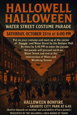 Saturday October 25 Hallowell Halloween Costume Parade assembles at 5:45 pm at the corner of Temple and Water Streets and walks North to Winthrop Street intersection where it then proceeds down to the Kennebec River Front at Granite City Park for a Halloween Bonfire with music.Join in the parade or watch it proceed through downtown. Several Restaurants and Pubs will have great foods, spirits and live entertainment.