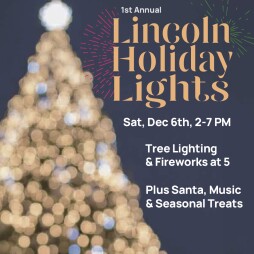 The centerpiece of the celebration will be the lighting of a 30-foot spruce tree, followed immediately by a fireworks display over Lincoln’s Main Street.