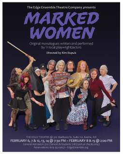For its first production of the 2026 season, The Edge Ensemble is offering a truly edgy and contemporary work called Marked Women. This show features 11 women performing original monologues they have written themselves. The character each actor has created – real or fictional – examines a defining event that has shaped her identity and sense of self. These women are marked, and they are telling their stories.