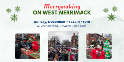 Come join us to kick off the holiday season! This free holiday street festival will include music, food, and fun activities. This event is perfect for families, friends, and anyone looking to have a good time. Don't miss out on the 3rd Annual Merrymaking on W. Merrimack - mark your calendars and spread the word!