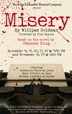 The Edge Ensemble’s fall show is Misery by William Goldman, based on Stephen King’s 1987 novel and subsequent 1990 film. When famed romance novelist Paul Sheldon is badly injured in a car crash that leaves him unconscious, he is rescued by his number one fan Annie Wilkes, who takes him to her secluded house to nurse him back to health. It rapidly becomes evident that Annie is mentally unstable. When a local sheriff comes to the house to investigate, all hell breaks loose.
