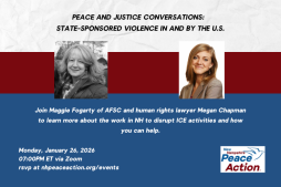 Maggie Fogarty joined the staff of AFSC-NH in 2007 when she and her family returned to the U.S after living and working for several years in Bolivia. Her work is dedicated to movement building for economic justice, racial justice, immigrant rights and nonviolence. She is the co-convener of the NH Immigrant Rights Network and NH Voices of Faith, facilitator for the Seacoast Interfaith Sanctuary Coalition, and co-leader of the NH Immigrant Visitation Program.