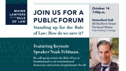 Maine Lawyers for the Rule of Law will host a free Public Forum, "Standing up for the Rule of Law: How do we save it?" on Tuesday, Oct. 14, 2025, in Portland featuring keynote speaker Noah Feldman, a distinguished constitutional law professor at Harvard Law School and acclaimed as "one of the country's most sought after authorities" on public policy and legal matters.