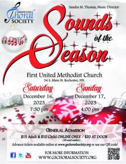 Under the direction of Sandra M. Thomas, Granite State Choral Society is proud to present Sounds of the Season. Featuring joyful pieces that reflect the spirit of the season--as well as classic holiday tunes reimagined as choral arrangements--there is something for everyone.