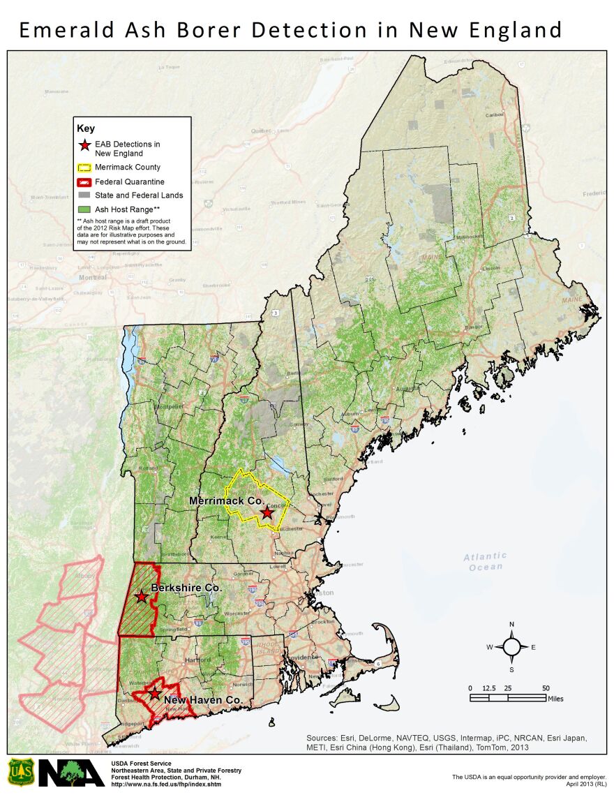 Merrimack county is under quarantine. Emerald Ash Borer, an invasive Asian beetle that has killed millions of Ash trees in the Midwest, has been discovered in Concord.