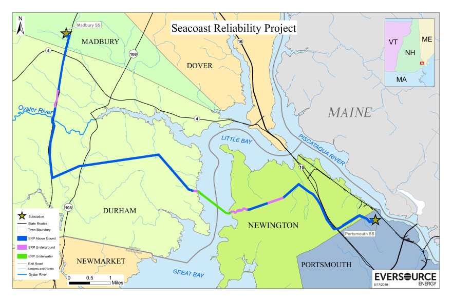 The Seacoast Reliability Project power line would span 13 miles between Madbury and Portsmouth, with one mile buried beneath Little Bay between Durham and Newington.