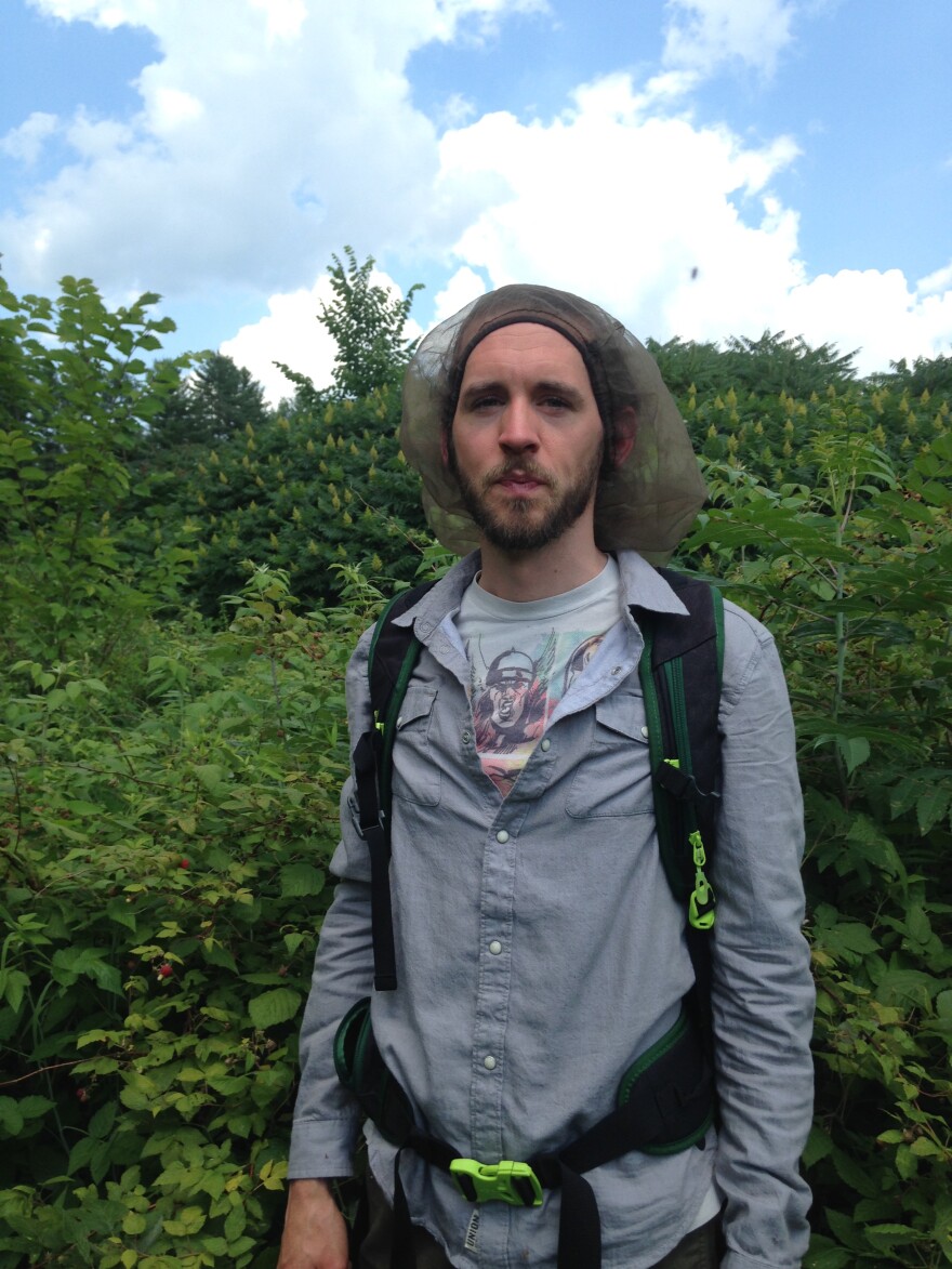 Wolfe is tall and slim, with a trimmed beard and dark hair knotted in a bun. A head net keeps mosquitos and black flies away from his face as he pushes his way toward a patch of black raspberries. Picking a couple, he pops the sweet berries into his mouth.