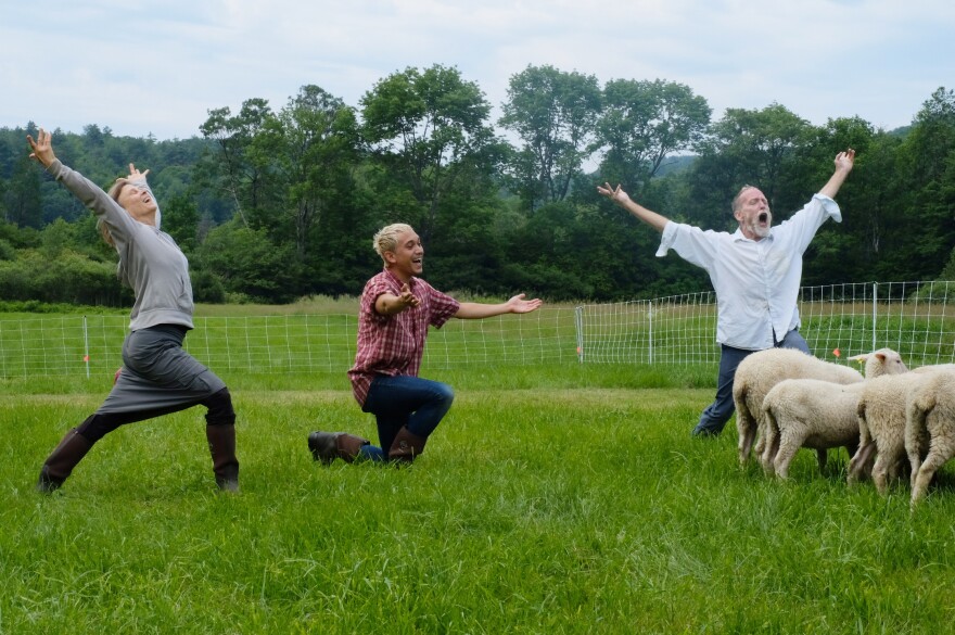 The team is rehearsing for "Doggie Hamlet," a performance piece by Carlson that will have its world premier at Dartmouth Thursday. They’re working one scene in particular — a “play within a play,” Carlson called it. It's one of the moments in the performance that has the strongest narrative, the most obvious storyline. The dancers appear as characters, putting on a show for the sheep.