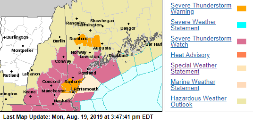 The National Weather Service has issued a severe thunderstorm watch for much of New Hampshire until 8 p.m. Monday.