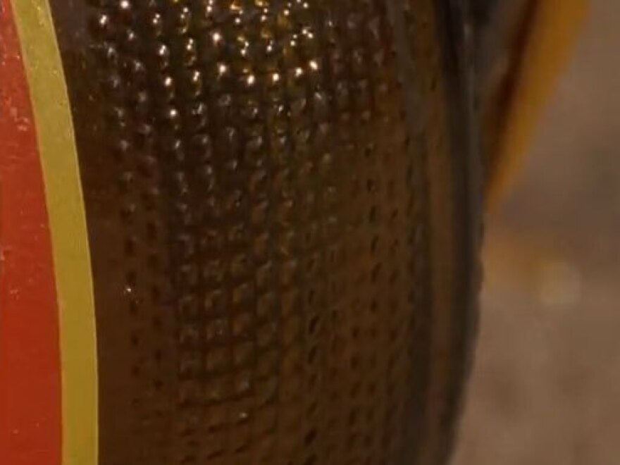 The answer became obvious when they got a close look at a female Australian jewel beetle. Females, as it happens, are golden brown. They are big — much bigger than the males. But most important, they are covered, as you see here, with dimples, little bumps.